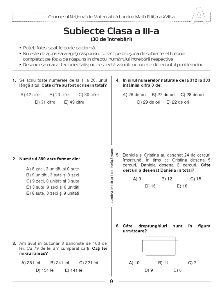 Subiecte la concursul comper la matematica clasa 1 an scolar 20102011. În cazul în care sunteți de acord cu primirea de informații prin newsletter, vă vom trimite noutǎți despre următoarele subiecte Obținerea punctajului aferent problemei este condiționată de identificarea tuturor variantelor de răspuns corecte și numai a acestora.
